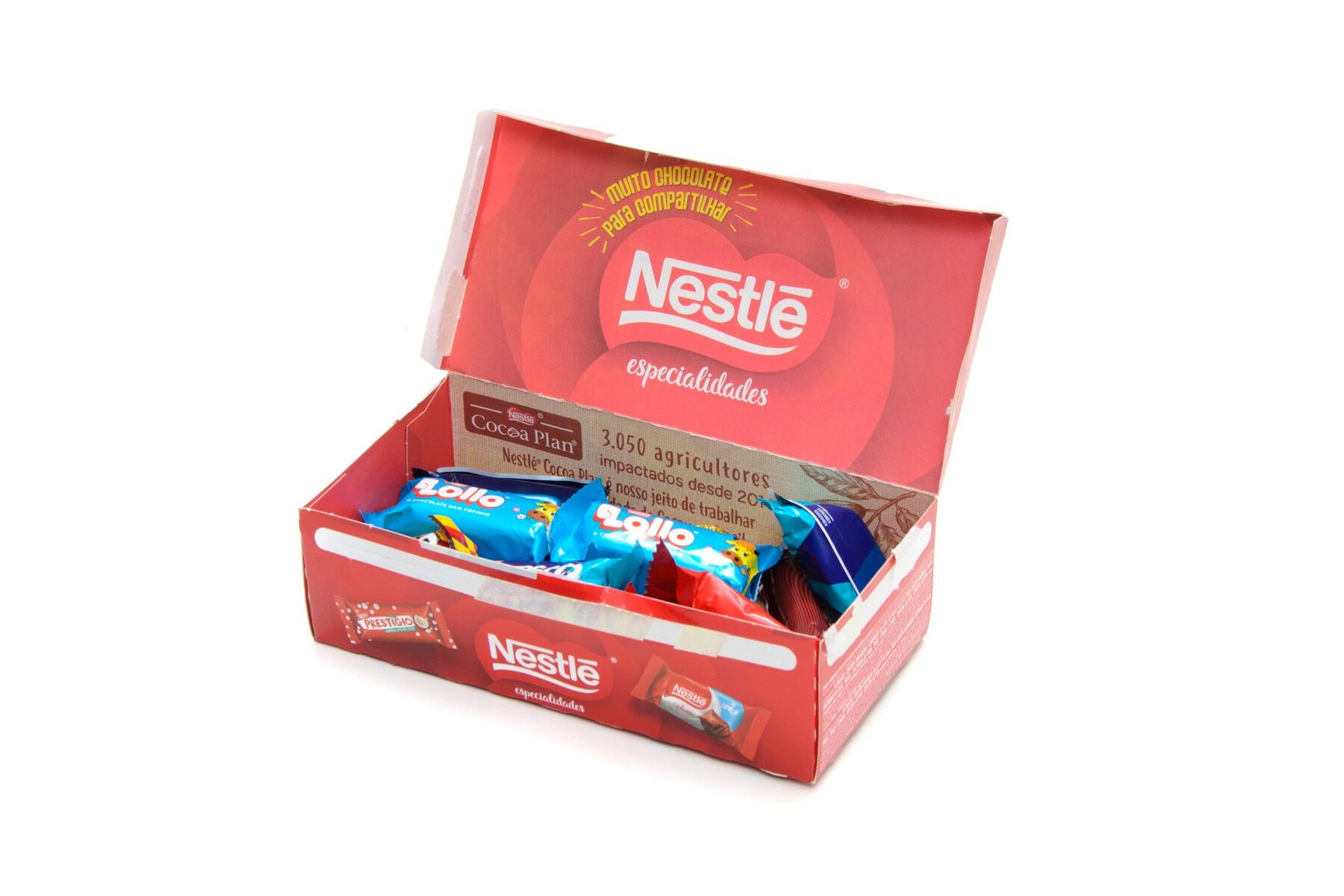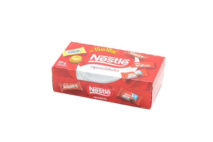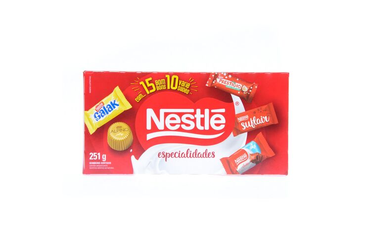A Caixa Nestlé® Especialidades junta os maiores sucessos da Nestlé em um lugar só. São variedades de chocolates em menores porções que enchem os olhos e agradam a todos os gostos.Essa caixa é composta pelos deliciosos bombons: Prestígio, Alpino, Suflair, Classic ao Leite, Galak, Lollo, Charge, Sensação, Chokito e Chokito Branco. Manter em local limpo, fresco, seco e sem cheiro.
