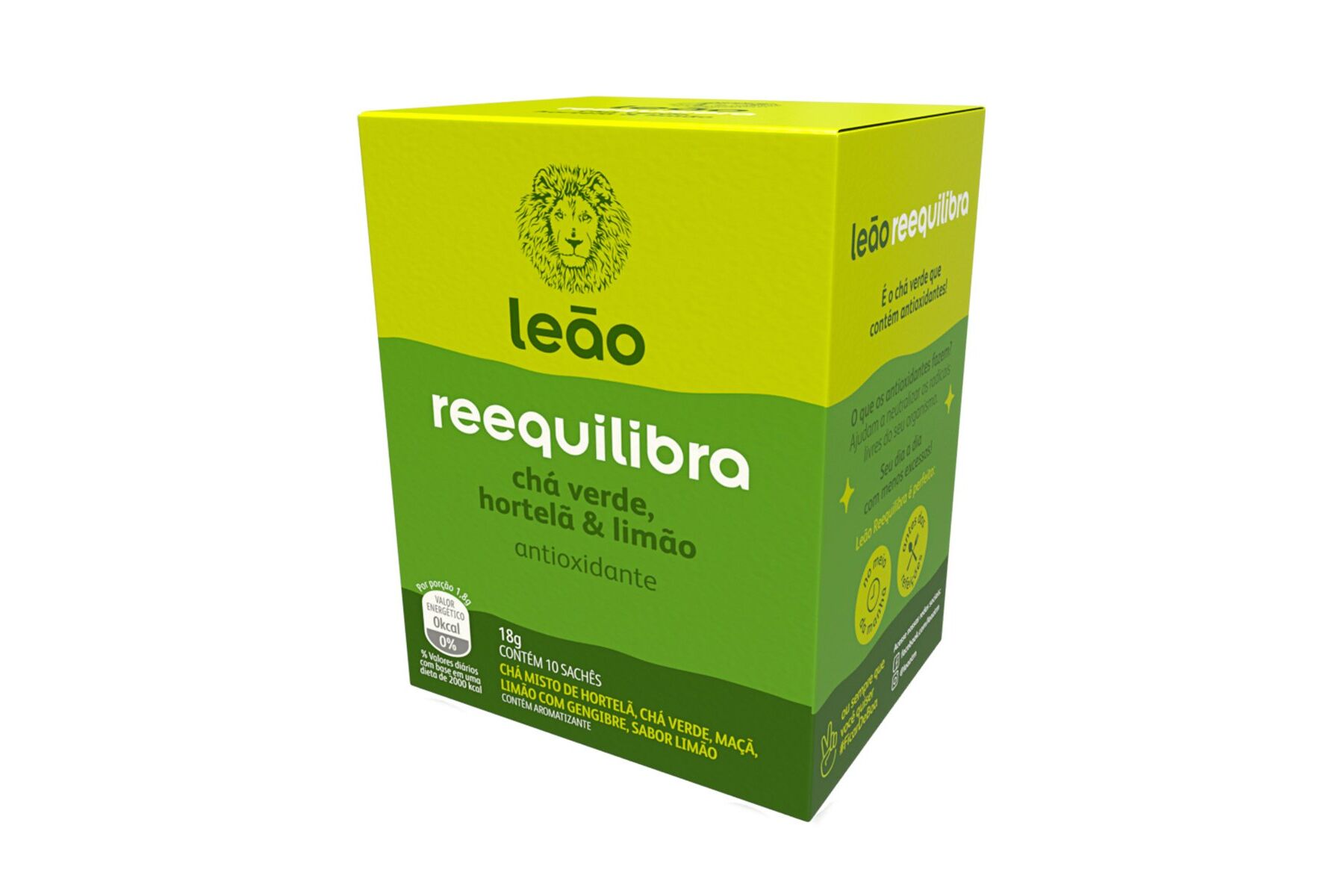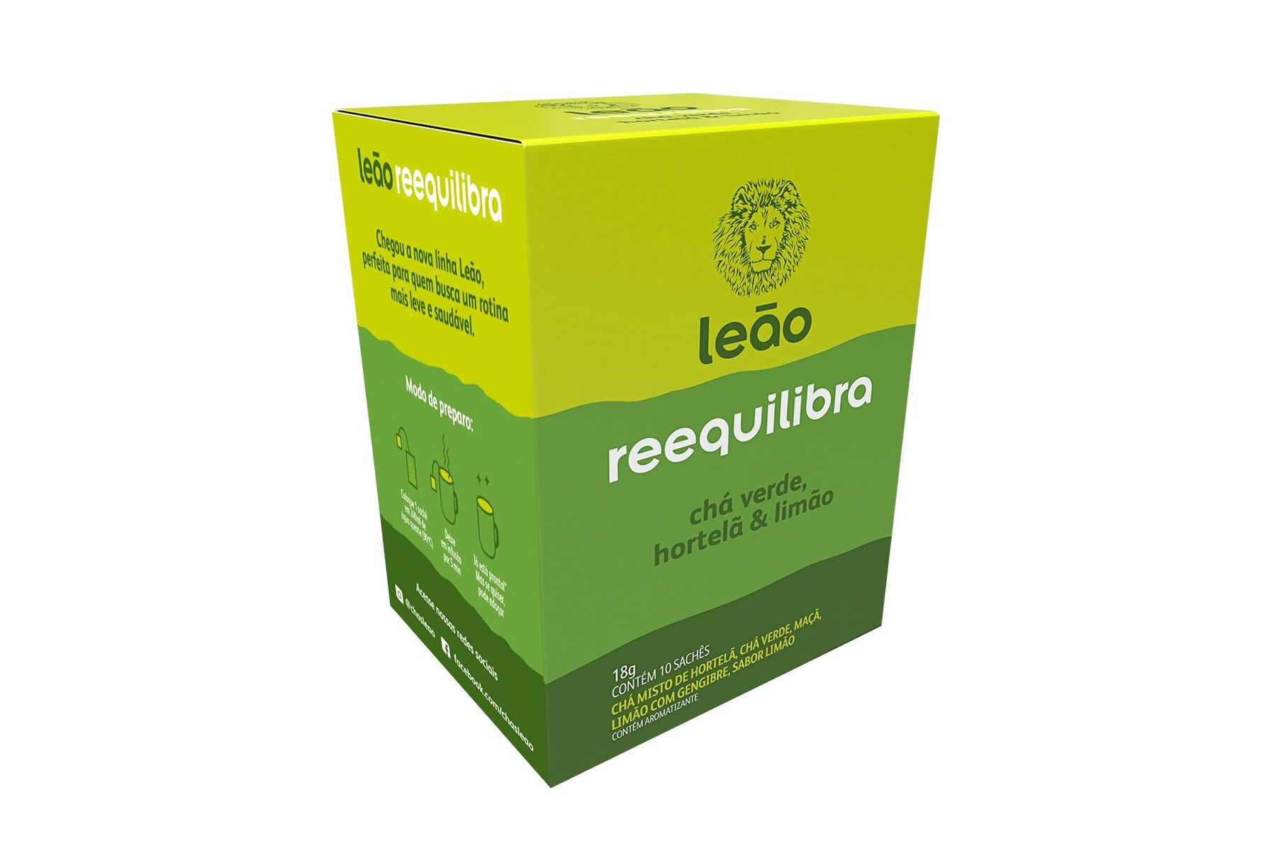 A Leão apresenta a linha bebidas para acompanhar a sua rotina para Ficar De Boa! Cada chá tem o seu momento e a Leão tem todos! Sabor: Chá verde, Hortelã e Limão. Aplicação: Infusão. Embalagem: Caixa com 10 (Dez) embalados individualmente. Porção: 1,8g (1 sachê). Carboidratos: 0,7g por porção (1 sachê). Nutricional: Os chás não possuem quantidade significativa de valor energético, proteínas, gorduras totais, gorduras saturadas, gorduras trans, fibra alimentar e sódio.