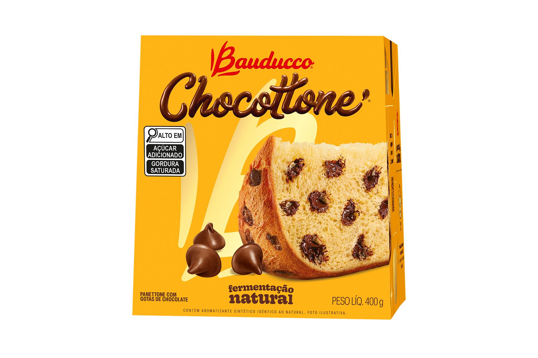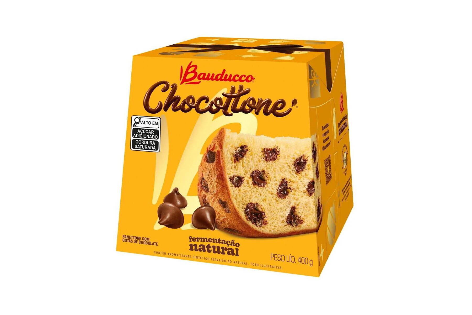 Chocottone com Gotas de Chocolate Bauducco 400g Só o Chocottone Bauducco tem a receita original trazida da Itália pelo próprio Sr. Bauducco. Cada fatia do Chocottone Bauducco tem a massa molhadinha, macia e o inconfundível sabor do Natal, feito com o mesmo carinho que une as famílias todos os anos.