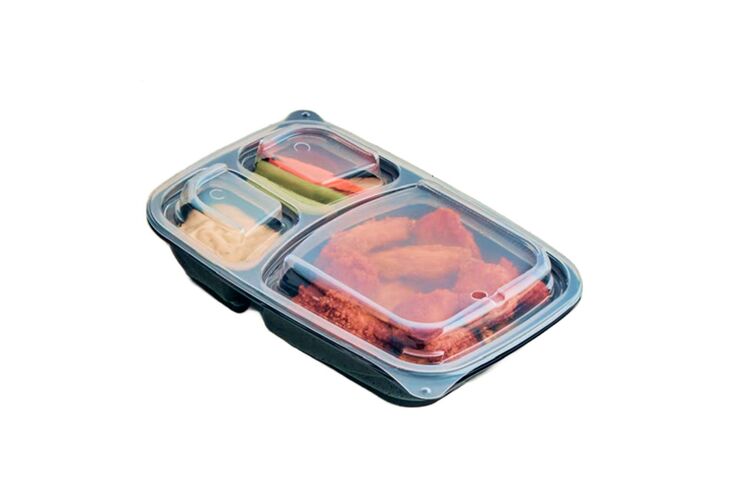 Marmiteiro PP Reutilizável ProtoGo 25,5x17,5x4,6cm 3 div. 32oz (946 ml) Preto com tampa Cristal.