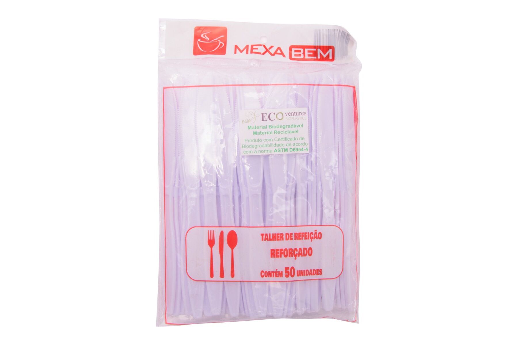 Os talheres Mexa Bem são a opção ideal para quem precisa fazer o seu lanche ou refeição, sem abrir mão de pensar em nosso planeta, pois o mexedores da linha Bio Mexa Bem são fabricados com aditivos biodegradáveis P-Life Eco Ventures. Com a adição deste aditivo à fórmula, o tempo de degradação do produto na natureza cai para até 3 anos (normalmente a degradação completa acontece em 1 ano), enquanto que as marcas e produtos tradicionais do mercado podem levar 50 anos para se degradar na natureza. Os mexedores Mexa Bem Bio, podem ser reciclados normalmente. Com a faca de refeição descartável você aproveita o melhor de suas refeições de uma forma prática, versátil e higiênica. São reforçados e resistentes, ideais para ocasiões que exigem praticidade sem perda de elegância e são ideais para refeições rápidas. Cada pacote possui 50 facas de 18cm de comprimento.