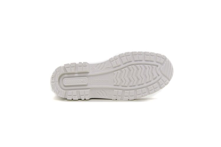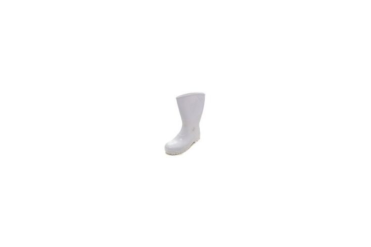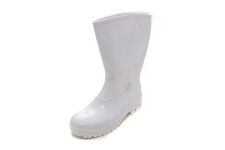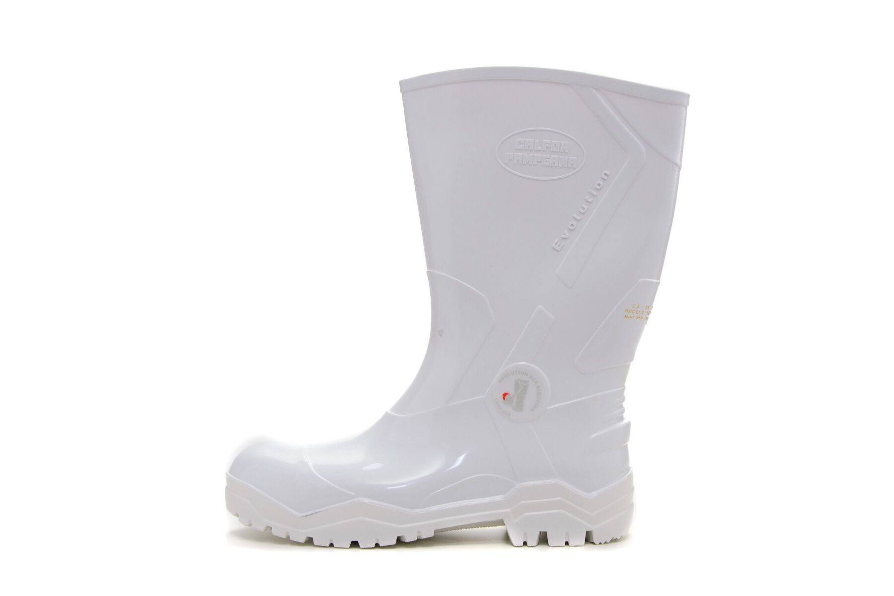 Bota de segurança, em cano longo (desenho tipo D), com cabedal e solado na cor branca, com sistema de absorção de energia no salto, impermeável, de uso profissional, confeccionada em policloreto de vinila (PVC), injetada em uma peça só. Acabamento interior com meia de poliéster na cor branca e biqueira de aço. Certificado de Aprovação: 35416