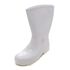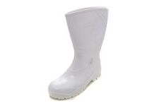 Bota de segurança, em cano longo (desenho tipo D), com cabedal e solado na cor branca, com sistema de absorção de energia no salto, impermeável, de uso profissional, confeccionada em policloreto de vinila (PVC), injetada em uma peça só. Acabamento interior com meia de poliéster na cor branca e biqueira de aço. Certificado de Aprovação: 35416