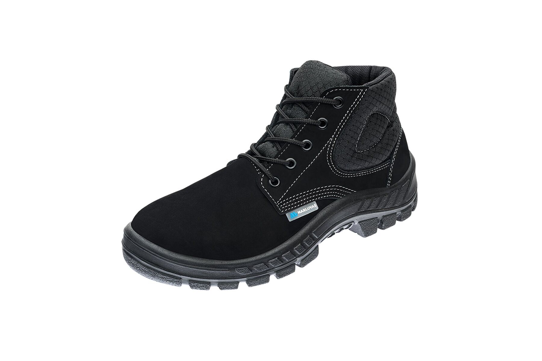 Calçado ocupacional tipo botina, fechamento em cadarço, confeccionado em couro nobuck na cor café curtido ao cromo, forro da gáspea em não tecido, forro lateral em tecido, palmilha de montagem em não tecido resinado fixada pelo sistema strobel, palmilha interna removível, solado de poliuretano bidensidade injetado diretamente no cabedal, biqueira de polipropileno para conformação. Certificado de Aprovação: 45611