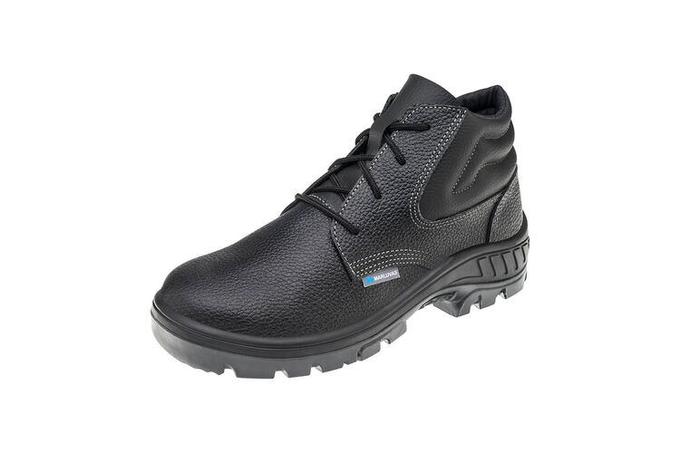 Calçado ocupacional, tipo botina, com fechamento em cardarço, confeccionado em couro curtido ao cromo na cor preta, palmilha de montagem em TNT – tecido não tecido resinado na cor branca, costurada pelo processo strobel, forro interno em TNT tecido não tecido na cor cinza, solado em poliuretano bidensidade, injetado diretamente ao cabedal na cor preta, com resistência ao óleo combustível e a absorção de energia no salto, biqueira de polipropileno. Certificado de Aprovação 41423