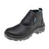 Calçado de segurança tipo botina, fechamento em elástico, confeccionado em couro curtido ao cromo, forro da gáspea em não tecido, forro lateral em tecido, palmilha de montagem em não tecido resinado costurado pelo sistema strobel, palmilha interna removível, biqueira de aço, solado de poliuretano bidensidade injetado diretamente no cabedal, resistente à absorção de energia na região do salto e ao óleo combustível. Certificado de Aprovação: 41429