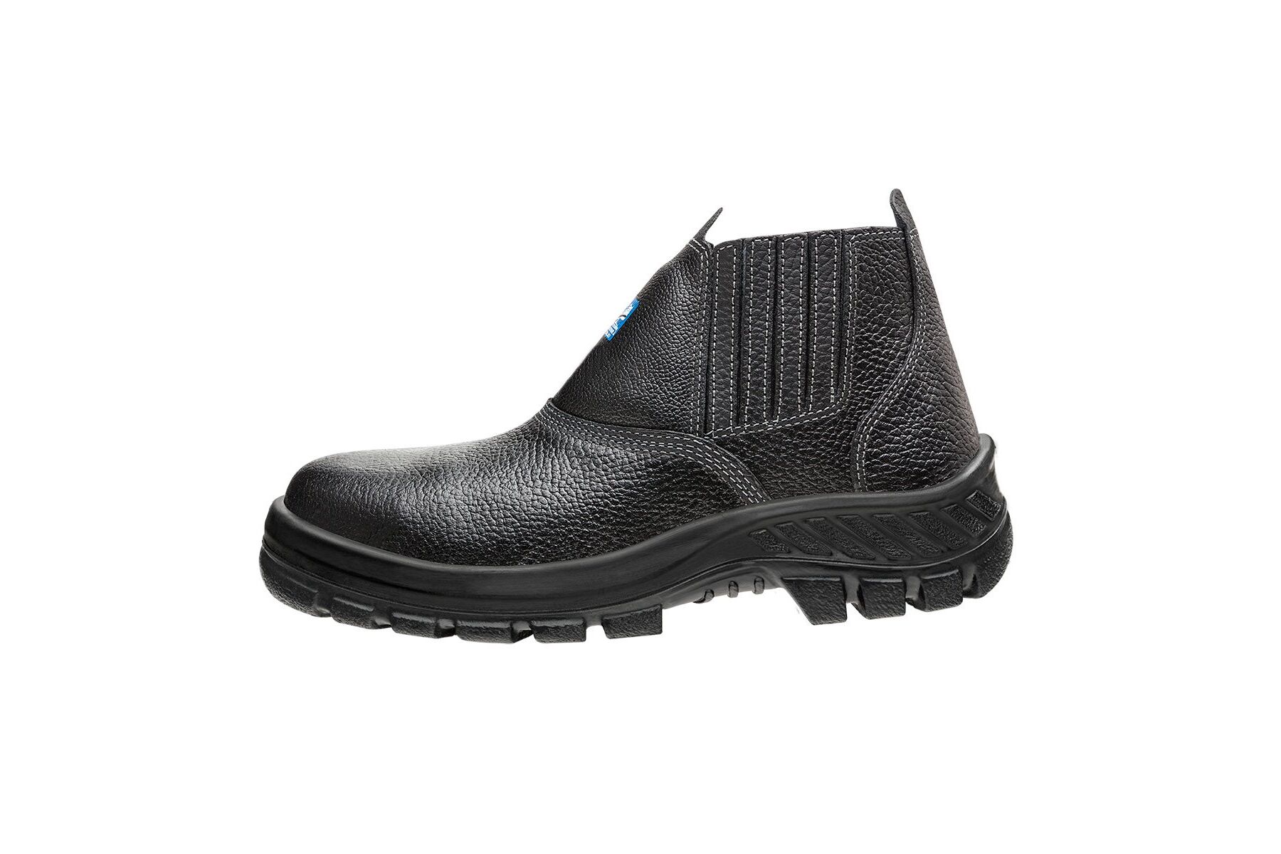 Calçado de segurança, tipo botina, com fechamento em elástico nas laterais, confeccionado em couro curtido ao cromo na cor preta, palmilha de montagem em material sintético na cor branca, costurada pelo processo strobel, forro interno em material não tecido na cor cinza, solado em poliuretano bidensidade injetado diretamente ao cabedal na cor preta, com biqueira de composite. Certificado de Aprovação: 47459