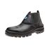 Calçado de segurança, tipo botina, com fechamento em elástico nas laterais, confeccionado em couro curtido ao cromo na cor preta, palmilha de montagem em material sintético na cor branca, costurada pelo processo strobel, forro interno em material não tecido na cor cinza, solado em poliuretano bidensidade injetado diretamente ao cabedal na cor preta, com biqueira de composite. Certificado de Aprovação: 47459
