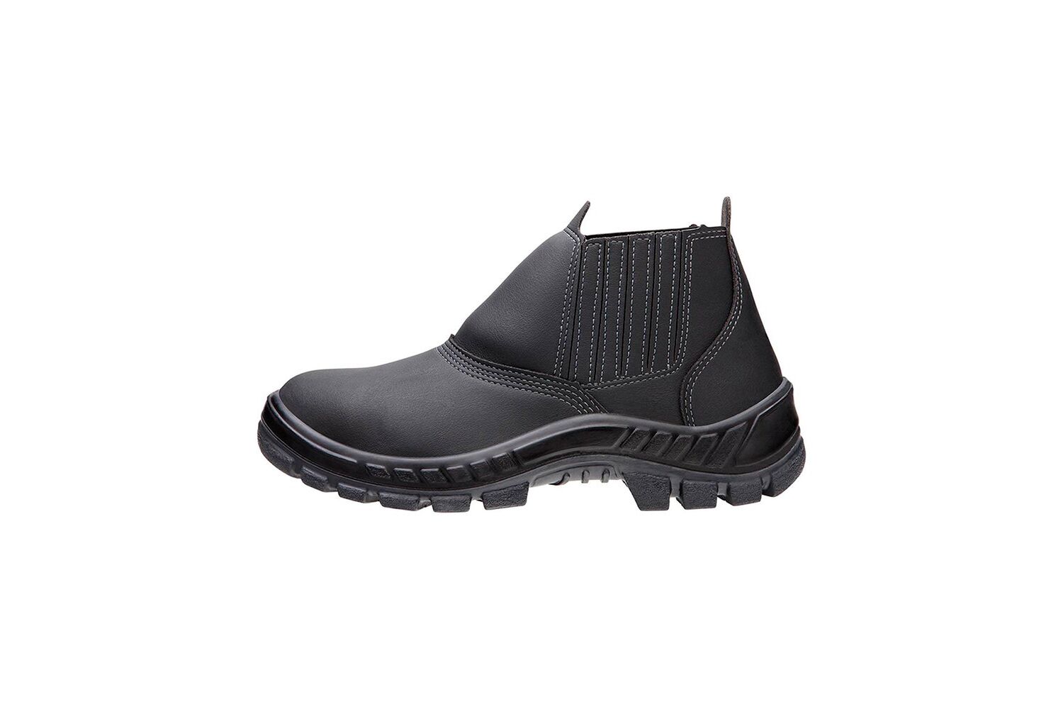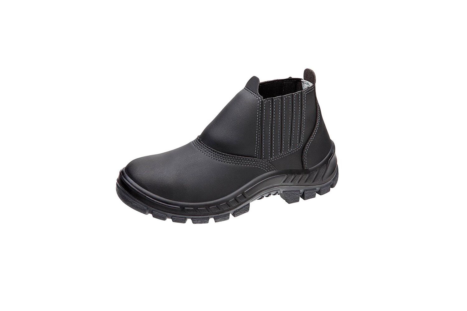 Calçado de segurança tipo botina, fechamento em elástico nas laterais, confeccionado em microfibra hidrofugada, palmilha de montagem em não tecido, costurada pelo processo strobel, forro interno em não tecido, biqueira de composite, solado de poliuretano bidensidade injetado diretamente no cabedal, resistente à absorção de energia na região do calcanhar e à passagem de corrente elétrica. Restrição: PARA TRABALHOS COM BAIXA TENSÃO (ATÉ 500 V) EM AMBIENTE SECO. Certificado de aprovação: 34554