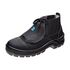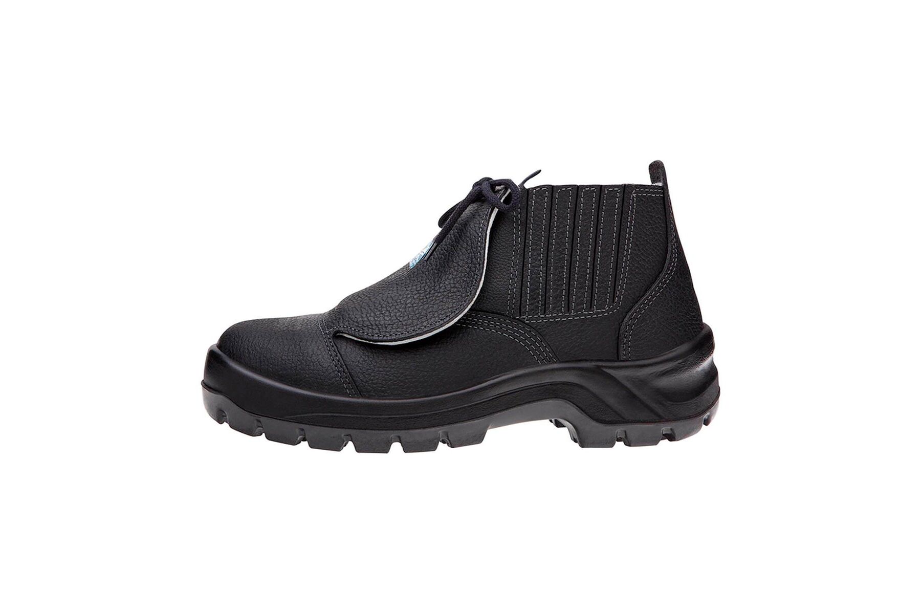 Calçado de segurança tipo botina, com fechamento em elástico nas laterais, confeccionado em couro curtido ao cromo na cor preta, palmilha de montagem em fibras não metálicas resistentes a perfuração e ao corte, na cor branca, costurada pelo processo strobel, forro interno em TNT – tecido não tecido na cor cinza. Solado em poliuretano bidensidade, injetado diretamente ao cabedal na cor preta com absorção de energia no salto, biqueira em composite e protetor de metatarso externo. Certificado de Aprovação: 43959