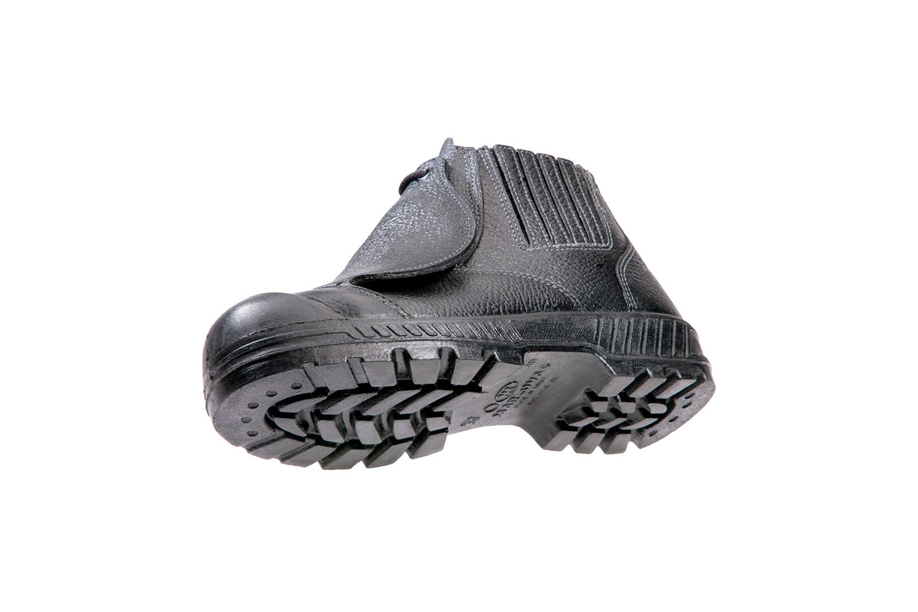 Calçado de segurança, tipo botina, com fechamento em elástico nas laterais, confeccionado em couro curtido ao cromo na cor preta, palmilha de montagem em TNT – tecido não tecido resinado na cor branca, costurada pelo processo strobel, forro interno em TNT tecido não tecido na cor cinza. Solado em poliuretano bidensidade, injetado diretamente ao cabedal na cor preta com absorção de energia no salto e resistência ao óleo combustível, biqueira em aço e protetor de metatarso. Certificado de Aprovação: 43274