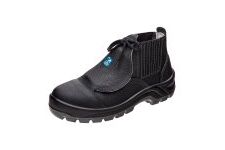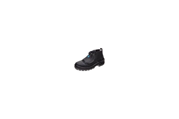 Calçado de segurança tipo botina, com fechamento em elástico nas laterais, confeccionado em couro curtido ao cromo na cor preta, palmilha de montagem em fibras não metálicas resistentes a perfuração e ao corte, na cor branca, costurada pelo processo strobel, forro interno em TNT – tecido não tecido na cor cinza. Solado em poliuretano bidensidade, injetado diretamente ao cabedal na cor preta com absorção de energia no salto, biqueira em composite e protetor de metatarso externo. Certificado de Aprovação: 43959