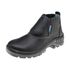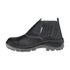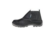Calçado de segurança, tipo botina, fechamento em elástico, confeccionado em couro curtido ao cromo na cor Calçado de segurança, tipo botina, com fechamento em elástico, confeccionado em couro curtido ao cromo na cor preta com resistência ao corte, palmilha de montagem em TNT – tecido não tecido resinado na cor branca, costurada pelo processo strobel, com palmilha de aço, forro interno em TNT tecido não tecido na cor cinza, solado em poliuretano bidensidade, injetado diretamente ao cabedal na cor preta, com resistência ao óleo combustível e a absorção de energia no salto, biqueira aço. Certificado de Aprovação 41430