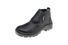Calçado ocupacional, tipo botina, com fechamento em elástico, confeccionado em couro curtido ao cromo na cor preta, palmilha de montagem em TNT – tecido não tecido resinado na cor branca, costurada pelo processo strobel, forro interno em TNT tecido não tecido na cor cinza, solado em poliuretano bidensidade, injetado diretamente ao cabedal na cor preta com biqueira de polipropileno. Certificado de Aprovação: 41419