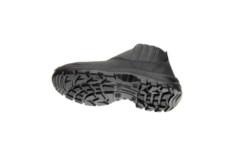 Calçado ocupacional tipo botina, fechamento em elástico nas laterais, confeccionado em couro na cor preta curtido ao cromo, cano acolchoado, palmilha de montagem em não tecido resinado fixada pelo sistema strobel, forro interno em não tecido, solado de poliuretano bidensidade injetado diretamente no cabedal, biqueira em polipropileno para conformação, resistente à absorção de energia no salto e ao óleo combustível. Linha Vulcaflex Certificado de Aprovação: 43377