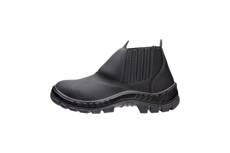 Calçado ocupacional tipo botina, fechamento em elástico, confeccionado em microfibra hidrofugada, região do dorso em material têxtil, forro da gáspea em não tecido, forro do dorso em tecido, palmilha de montagem em material sintético resinado costurado pelo sistema strobel, palmilha interna removível, biqueira de polipropileno para conformação, solado de poliuretano bidensidade injetado diretamente no cabedal, resistente à absorção de energia na região do salto e ao óleo combustível. Certificado de Aprovação: 34500