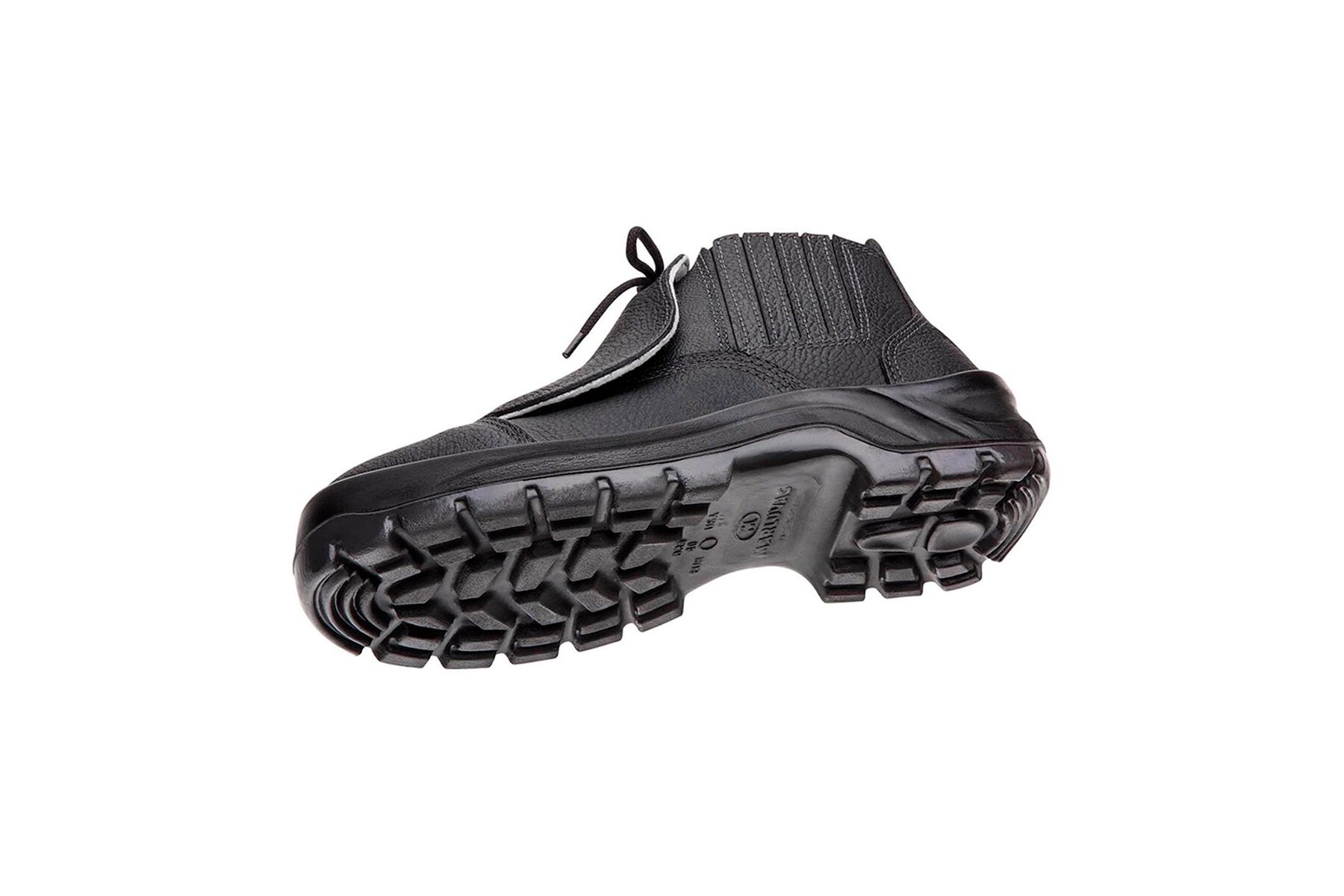 Calçado de segurança tipo botina, com fechamento em elástico nas laterais, confeccionado em couro curtido ao cromo na cor preta, palmilha de montagem em fibras não metálicas resistentes a perfuração e ao corte, na cor branca, costurada pelo processo strobel, forro interno em TNT – tecido não tecido na cor cinza. Solado em poliuretano bidensidade, injetado diretamente ao cabedal na cor preta com absorção de energia no salto, biqueira em composite e protetor de metatarso externo. Certificado de Aprovação: 43959