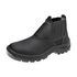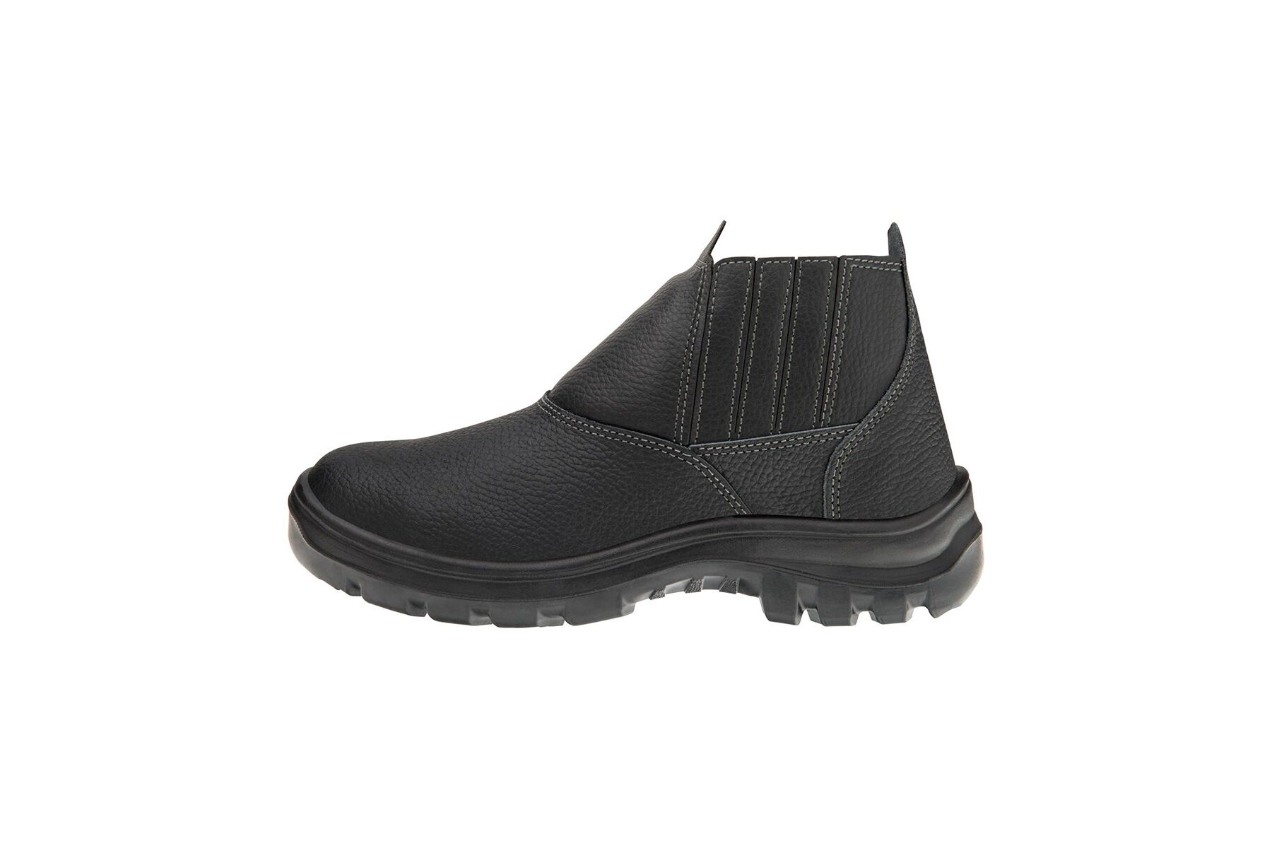 Calçado de segurança tipo botina, fechamento em elástico nas laterais, confeccionado em couro na cor preta curtido ao cromo, palmilha de montagem em não tecido resinado fixada pelo sistema strobel, forro interno em não tecido, solado de poliuretano bidensidade injetado diretamente no cabedal, biqueira de aço, resistente à absorção de energia no salto e ao óleo combustível. Certificado de Aprovação: 43339