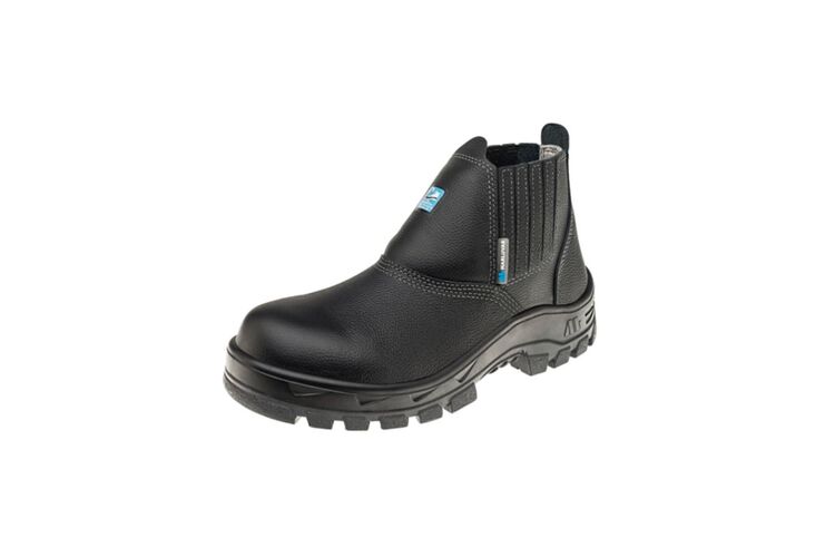 Calçado de segurança tipo botina, fechamento em elástico nas laterais, confeccionado em couro na cor preta curtido ao cromo, palmilha de montagem em fibras não metálicas de cor branca resistente a perfuração fixada pelo sistema strobel, forro em não tecido na cor cinza, solado bicomponente de borracha e poliuretano injetado diretamente no cabedal, biqueira de composite, resistente a absorção de energia no calcanhar, ao contato com o calor e ao óleo combustível. Certificado de Aprovação:25013