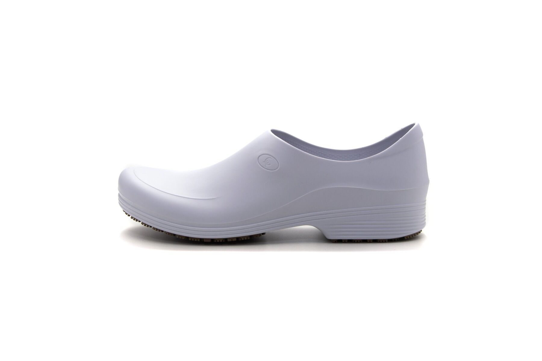 Calçado ocupacional, Classe II, tipo A (calçado baixo), confeccionado em material polimérico de cor branca, com solado de borracha antiderrapante de cor bege, com absorção de energia no calcanhar, solado resistente ao escorregamento em piso de cerâmica contaminado com detergente e em piso de aço contaminado com glicerol (óleo), e calçado inteiro resistente a água. Possui palmilha interna removível. Certificado de Aprovação: 39848