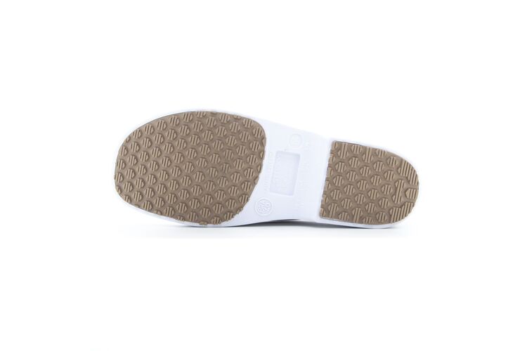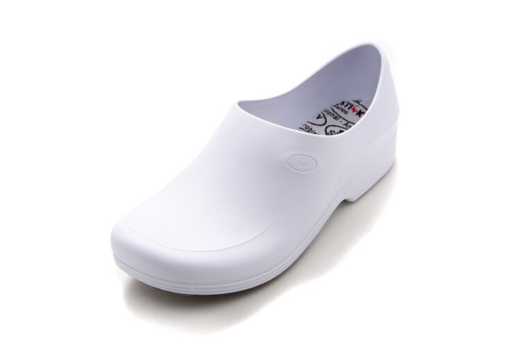 Calçado ocupacional, classe II, tipo A (calçado baixo), confeccionado em material polimérico de cor branca, com solado de borracha vulcanizada antiderrapante de cor bege, com absorção de energia no calcanhar, solado resistente ao escorregamento em piso de cerâmica contaminado com detergente e em piso de aço contaminado com glicerol, e calçado inteiro resistente à água. Possui palmilha interna removível. Certificado de Aprovação: 39674
