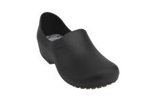 Calçado ocupacional, classe II, tipo A (calçado baixo), confeccionado em material polimérico de cor preta, com solado de borracha vulcanizada antiderrapante de cor bege, com absorção de energia no calcanhar, solado resistente ao escorregamento em piso de cerâmica contaminado com detergente e em piso de aço contaminado com glicerol, e calçado inteiro resistente à água. Possui palmilha interna removível. Certificado de Aprovação: 39848
