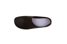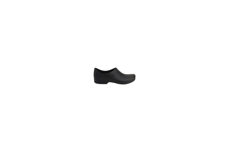 Calçado ocupacional, classe II, tipo A (calçado baixo), confeccionado em material polimérico de cor preta, com solado de borracha vulcanizada antiderrapante de cor bege, com absorção de energia no calcanhar, solado resistente ao escorregamento em piso de cerâmica contaminado com detergente e em piso de aço contaminado com glicerol, e calçado inteiro resistente à água. Possui palmilha interna removível. Certificado de Aprovação: 39674