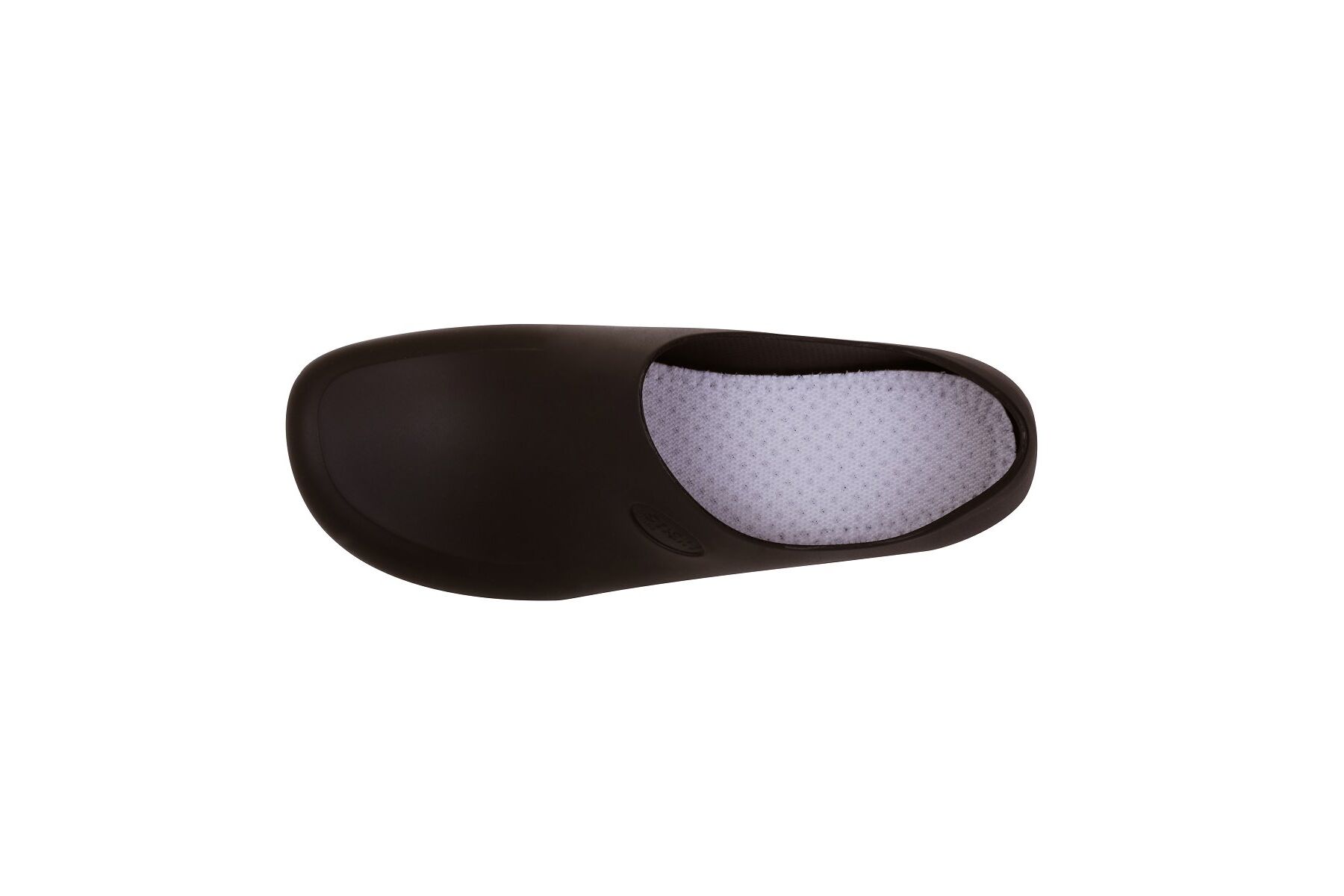 Calçado ocupacional, classe II, tipo A (calçado baixo), confeccionado em material polimérico de cor preta, com solado de borracha vulcanizada antiderrapante de cor bege, com absorção de energia no calcanhar, solado resistente ao escorregamento em piso de cerâmica contaminado com detergente e em piso de aço contaminado com glicerol, e calçado inteiro resistente à água. Possui palmilha interna removível. Certificado de Aprovação: 39674