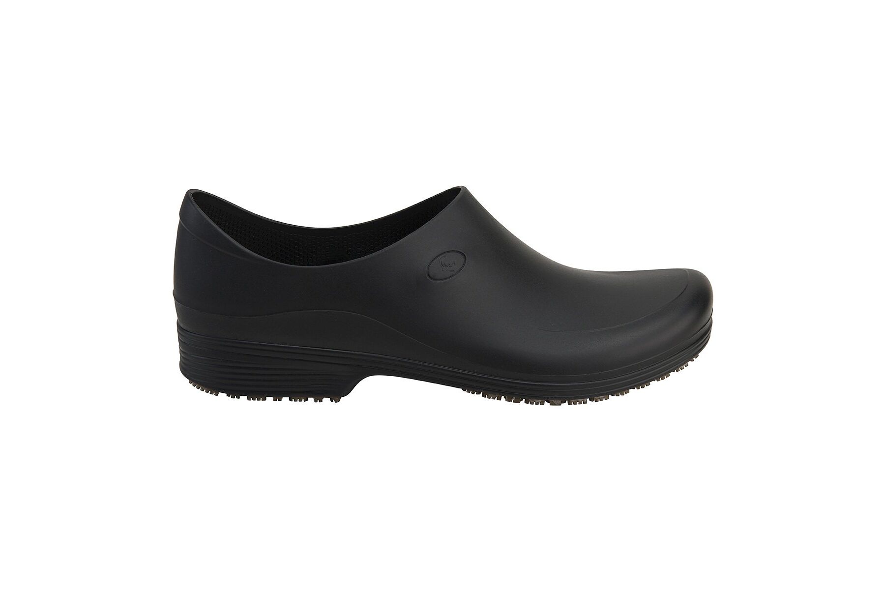 Calçado ocupacional, classe II, tipo A (calçado baixo), confeccionado em material polimérico de cor preta, com solado de borracha vulcanizada antiderrapante de cor bege, com absorção de energia no calcanhar, solado resistente ao escorregamento em piso de cerâmica contaminado com detergente e em piso de aço contaminado com glicerol, e calçado inteiro resistente à água. Possui palmilha interna removível. Certificado de Aprovação: 39674