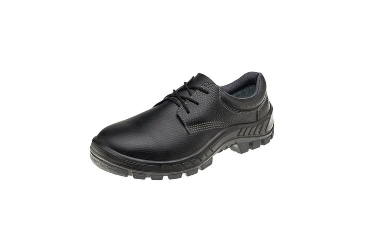 Calçado de segurança, tipo sapato, com fechamento em cadarço, confeccionado em couro curtido ao cromo na cor preta, palmilha de montagem em material sintético, na cor branca, costurada pelo processo strobel, forro interno em material não tecido na cor cinza. Solado em poliuretano bidensidade, injetado diretamente ao cabedal na cor preta, com biqueira de composite. Certificado de Aprovação: 45916