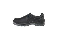 Calçado ocupacional, tipo sapato, fechamento em elástico, confeccionado em couro preto curtido ao cromo, palmilha de montagem em material sintético resinado na cor branca costurada pelo sistema strobel, forro em não tecido na cor cinza, solado de poliuretano bidensidade na cor preta injetado diretamente no cabedal, biqueira plástica para conformação, solado resistente ao óleo combustível, à passagem de corrente elétrica e à absorção de energia no calcanhar. Certificado de Aprovação: 41420