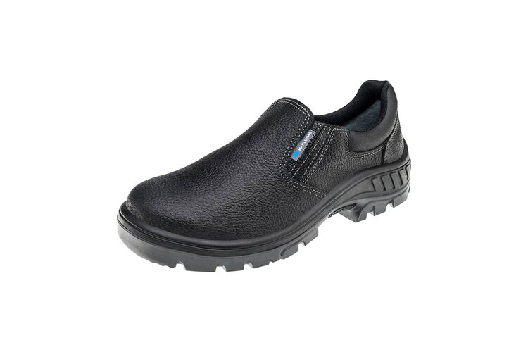 Calçado ocupacional, tipo sapato, fechamento em elástico, confeccionado em couro preto curtido ao cromo, palmilha de montagem em material sintético resinado na cor branca costurada pelo sistema strobel, forro em não tecido na cor cinza, solado de poliuretano bidensidade na cor preta injetado diretamente no cabedal, biqueira plástica para conformação, solado resistente ao óleo combustível, à passagem de corrente elétrica e à absorção de energia no calcanhar. Certificado de Aprovação: 41420