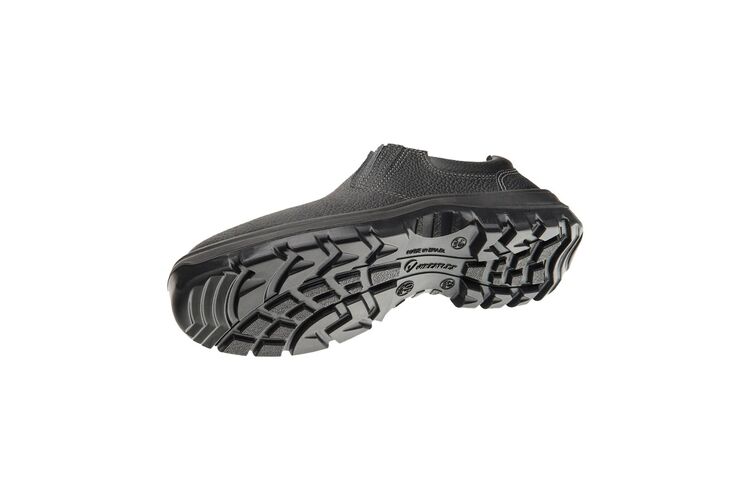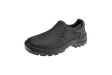 Calçado de segurança tipo tênis, fechamento em elástico nas laterais, confeccionado em couro na cor preta curtido ao cromo, palmilha de montagem em nãotecido resinado fixada pelo sistema strobel, forro interno em nãotecido, solado de poliuretano bidensidade injetado diretamente no cabedal, biqueira de aço, resistente à absorção de energia no salto e ao óleo combustível. Certificado de Aprovação: 43341