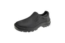Calçado de segurança tipo tênis, fechamento em elástico nas laterais, confeccionado em couro na cor preta curtido ao cromo, palmilha de montagem em não tecido resinado fixada pelo sistema strobel, forro interno em não tecido, solado de poliuretano bidensidade injetado diretamente no cabedal, biqueira de aço, resistente à absorção de energia no salto e ao óleo combustível. Certificado de Aprovação: 43341