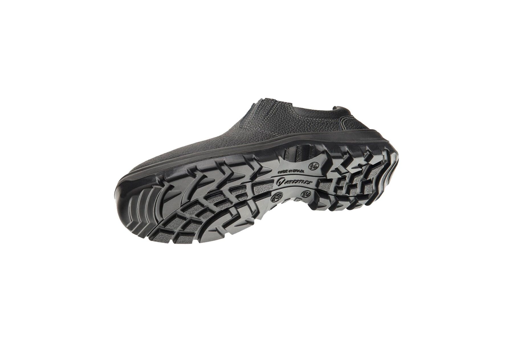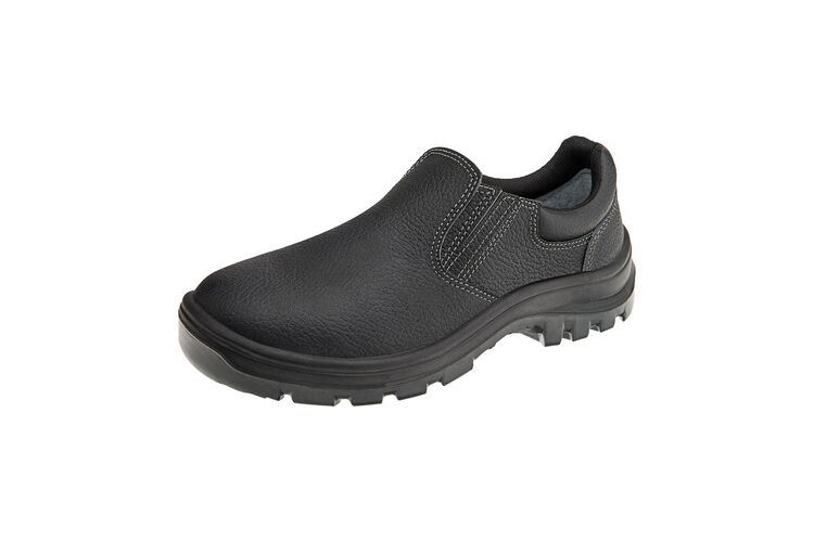 Calçado ocupacional de uso profissional tipo sapato, fechamento em elástico nas laterais, confeccionado em couro curtido ao cromo, colarinho em material têxtil, forro da gáspea em nãotecido, forro lateral em tecido, palmilha de montagem em nãotecido resinado costurada pelo processo strobel, palmilha interna removível, biqueira em polipropileno para conformação, solado em poliuretano bidensidade injetado diretamente ao cabedal, resistente à absorção de energia no salto e ao óleo combustível. Certificado de Aprovação: 43334