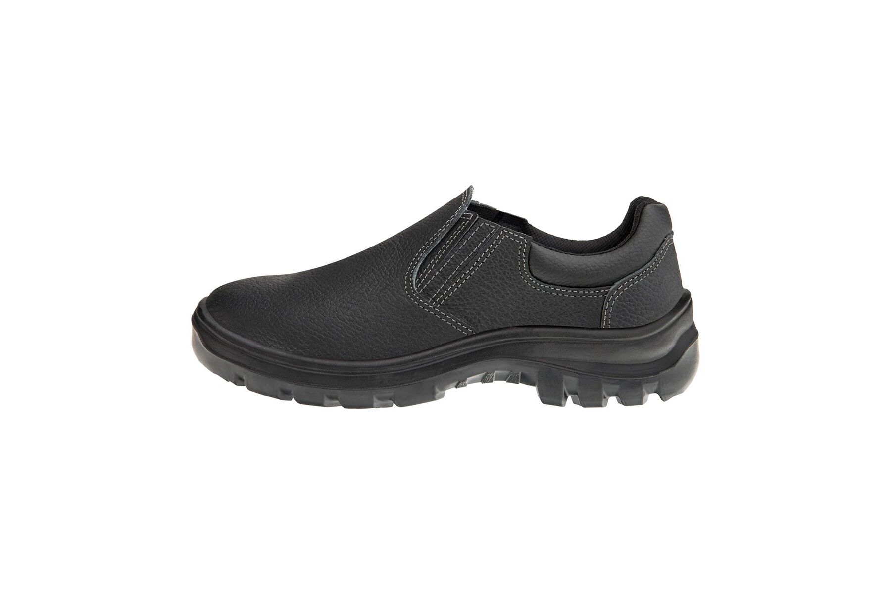 Calçado ocupacional de uso profissional tipo sapato, fechamento em elástico nas laterais, confeccionado em couro curtido ao cromo, colarinho em material têxtil, forro da gáspea em nãotecido, forro lateral em tecido, palmilha de montagem em nãotecido resinado costurada pelo processo strobel, palmilha interna removível, biqueira em polipropileno para conformação, solado em poliuretano bidensidade injetado diretamente ao cabedal, resistente à absorção de energia no salto e ao óleo combustível. Certificado de Aprovação: 43334
