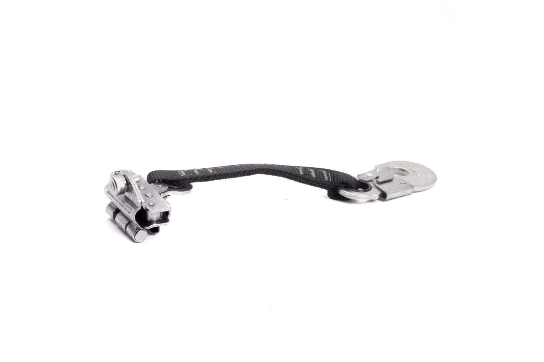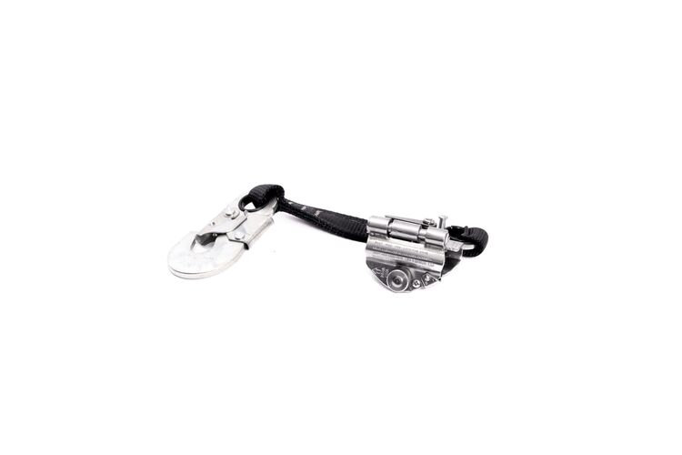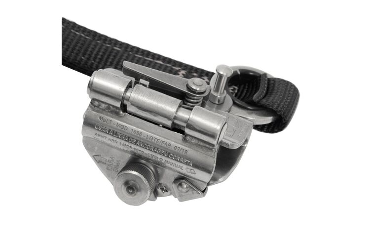 Travaqueda de aço inox para corda de 12mm com extensor em fita. Conector classe T com abertura de 18mm. Duplo travamento do corpo. Alavanca de posicionamento para subir e descer livremente. Trava de posicionamento.