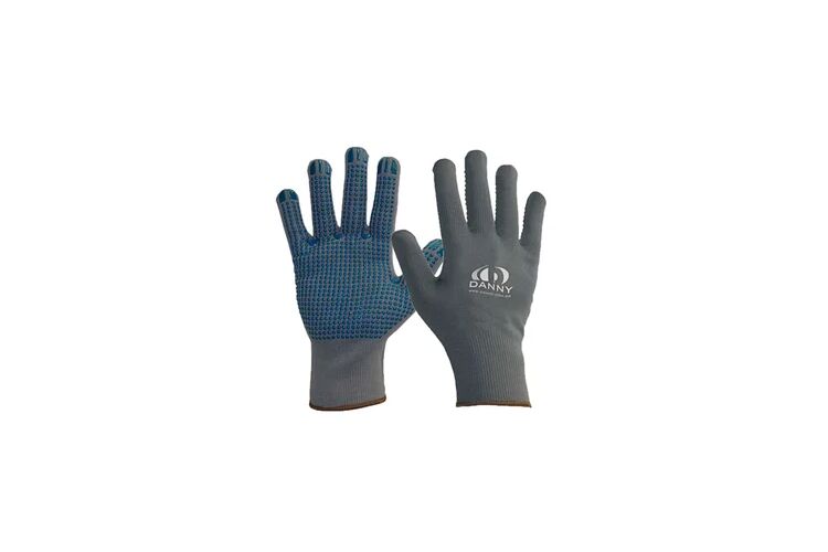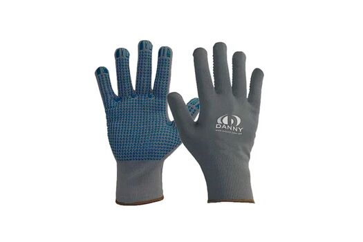Luva de Segurança tricotada em fio de poliéster, com aplicação de PVC antiderrapante na palma e face palmar dos dedos, punho tricotado com elástico e acabamento em overloque.