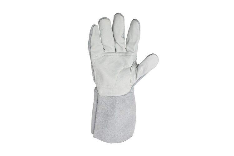 Luva de segurança confeccionada em vaqueta na palma e raspa no dorso e nos punhos, com reforço no polegar e reforço palmar, costurada em linha de algodão. Medida do punho aproximado: 15cm Certificado de Aprovação: 42880