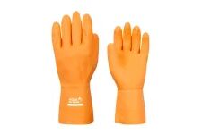 Luva de segurança confeccionada em látex natural, reforçada com uma blenda com neoprene, revestimento interno em flocos de algodão e acabamento antiderrapante na face palmar e ponta dos dedos. Luva para proteção contra agentes químicos. Certificado de Aprovação: 16311