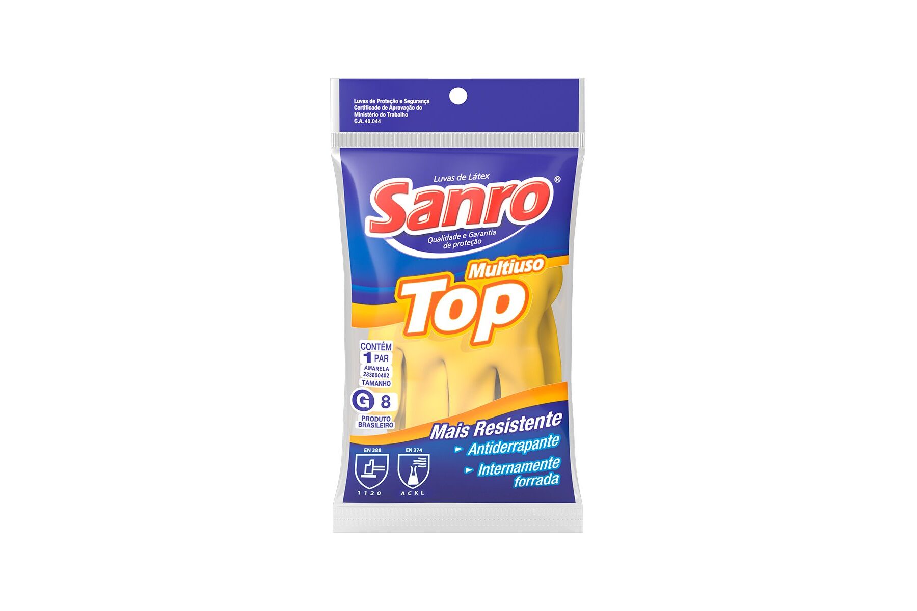 Luva de segurança, confeccionada em látex de borracha natural, formato anatômico, forrada internamente, superfície antiderrapante em relevo nas principais áreas de contato da mão e dedo, com bainha. Certificado de Aprovação: 40044