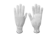 Luva de segurança tricotada em fios de fibras sintéticas e fio de aço recoberto, punho com inserções de fibras elásticas e acabamento final em fibras sintéticas. Certificado de Aprovação: 36825