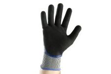 Luva de Segurança confeccionada em fibras sintéticas, polietileno de alto peso molecular (HPPE), 13 gauge, revestida totalmente em Nitrílica lisa na palma da mão, ponta dos dedos e dorso com uma segunda camada de Nitrílica arenosa (sandy) na palma da mão e nas pontas dos dedos, punho com inserção de fibras elásticas e acabamento em fibras sintéticas. Certificado de Aprovação: 36848