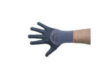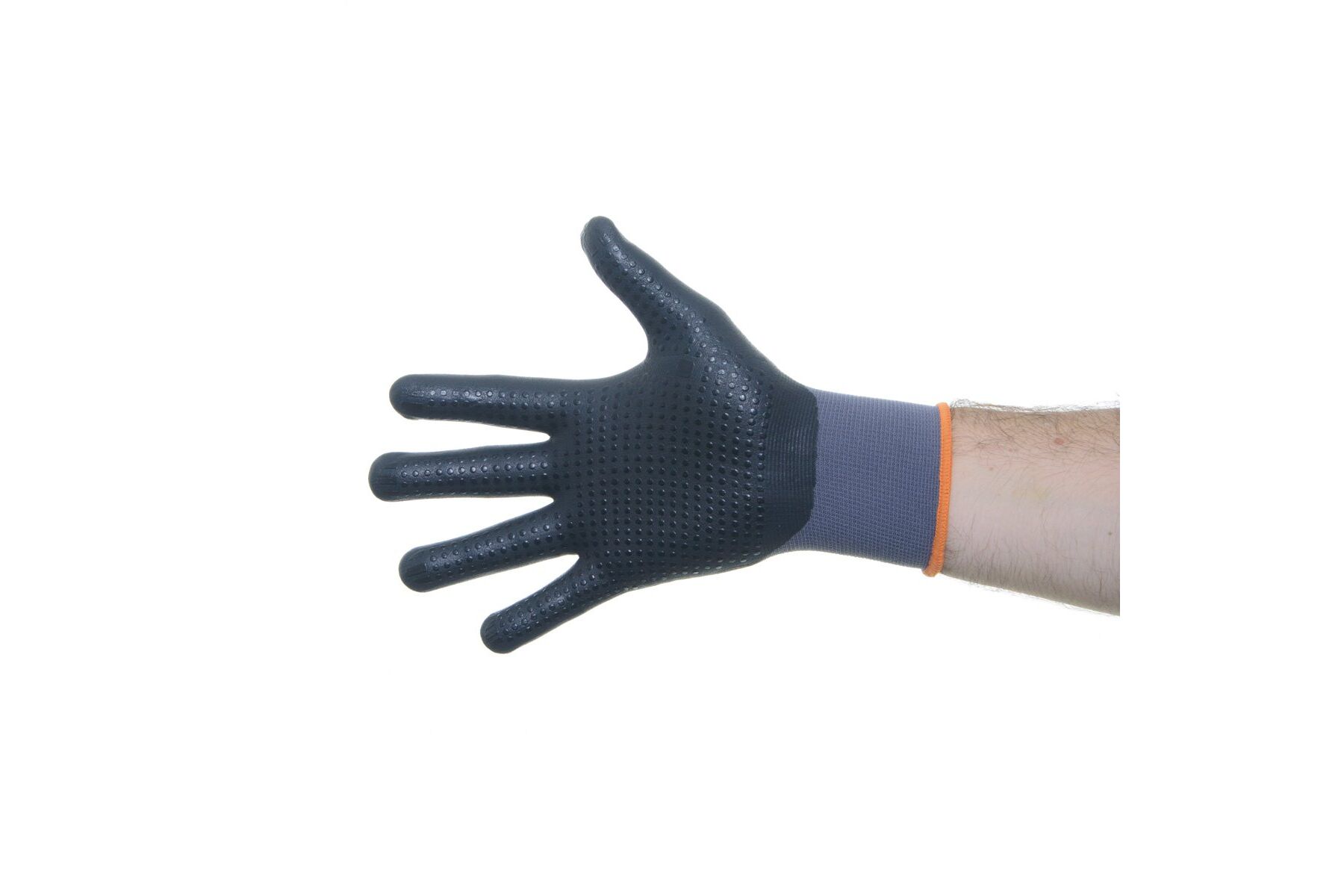 Luva de segurança confeccionada em fios de nylon e spandex, revestimento em nitrílico misto com poliuretano (PU) base dágua tipo foam na região palmar, ponta dos dedos e dorso, com pigmentos em nitrílico na região palmar e face palmar dos dedos, punho em elastano e acabamento final em fibras sintéticas. Certificado de Aprovação: 37168