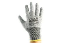 Luva de segurança confeccionada em fibras sintéticas, HPPE (polietileno de alto peso molecular), 13 gauge, revestida em poliuretano (PU) na palma e ponta dos dedos, punho com inserção de fibras elásticas e acabamento em fibras sintéticas. Certificado de Aprovação: 37266