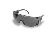 Óculos de segurança constituídos de armação, apoio nasal e visor confeccionados em uma única peça de policarbonato disponível nas cores incolor, amarelo, verde e cinza com meia borda superior e laterais com meia proteção nas extremidades do visor, hastes tipo espátula confeccionadas do mesmo material da armação com seis fendas fixadas através de pinos plásticos. Certificado de Aprovação: 10344