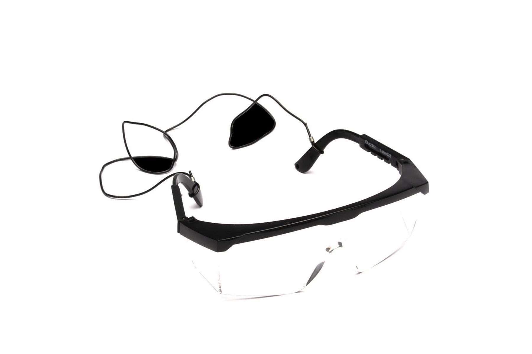 Óculos de segurança, constituídos de um arco de material plástico preto com três pinos, sendo: um central e um em cada extremidade e fenda nas extremidades, utilizadas para o encaixe de um visor de policarbonato incolor, cinza, verde claro ou verde escuro (tonalidade 5.0), com apoio nasal e proteção lateral confeccionados do mesmo material e injetados em uma única peça, com um orifício na parte frontal superior e uma fenda em cada extremidade para o encaixe no arco. O arco possui proteção superior nas bordas. As hastes são confeccionadas do mesmo material do arco e são compostas de duas peças: uma semi-haste vazada com uma das extremidades fixadas ao arco por meio de pino metálico e outra semi-haste com um pino plástico em uma das extremidades e que se encaixa na outra extremidade da semi-haste anterior e que permite o ajuste do tamanho. Certificado de Aprovação: 12572