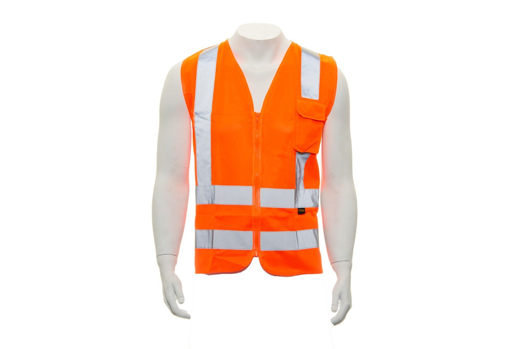Colete de sinalização de alta visibilidade, com 1 bolso. Confeccionado em tecido fluorescente 100% poliéster, combinado com faixas retrorrefletivas repelentes de água em X, com paralelas horizontais nas costas, verticais e horizontais na parte frontal, fechamento frontal em zíper.