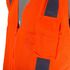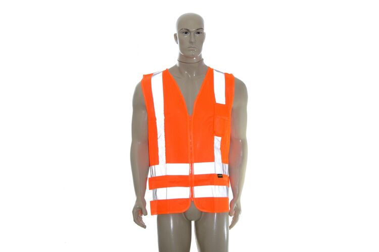 Colete de sinalização de alta visibilidade, com 1 bolso. Confeccionado em tecido fluorescente 100% poliéster, combinado com faixas retrorrefletivas repelentes de água em X, com paralelas horizontais nas costas, verticais e horizontais na parte frontal, fechamento frontal em zíper.