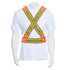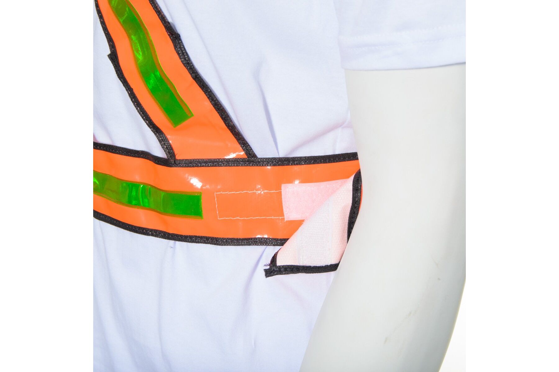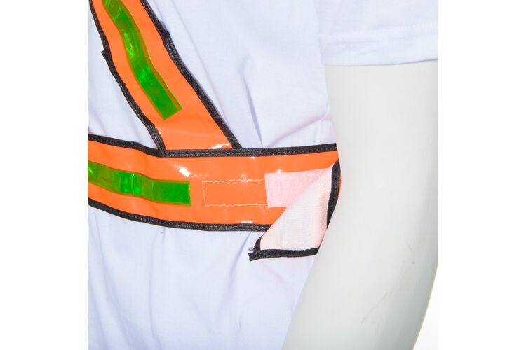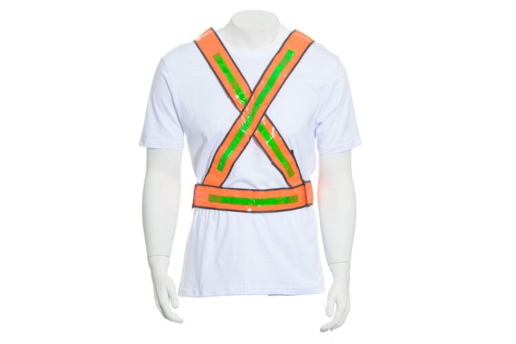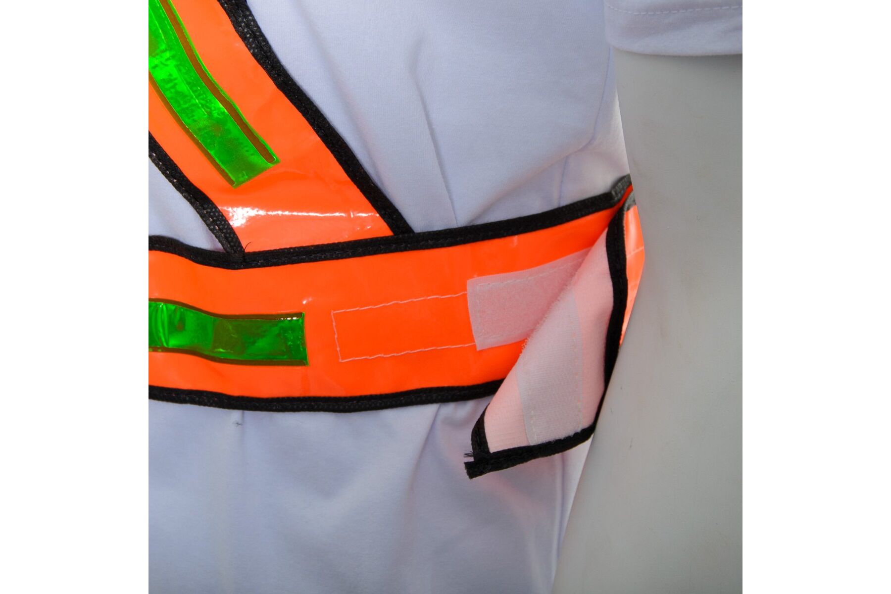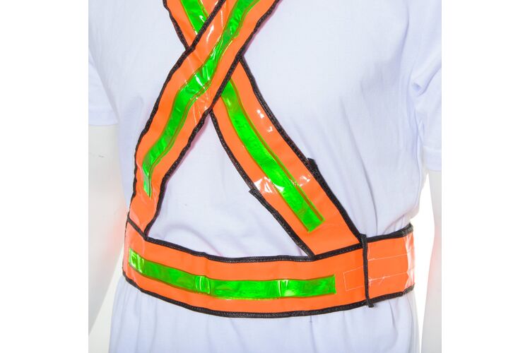 Colete de sinalização em X laranja com faixas refletivas, confeccionado em material impermeável, fechamento lateral em velcro com 5x10 cm. Tamanho Único